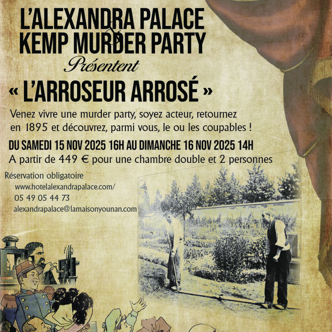 Le 15 et 16 novembre 2025 …1895, l'Alexandra Palace et Kemp Murder Party vous entraînent au cœur du premier film des Frères Lumière. Vous assisterez à la 1ère projection cinématographique des Frères Lumière : "L'arroseur arrosé". Toutes les célébrités de l'époque seront présentes. Un crime lors d'un tel évènement mettrait dans l'embarras toutes les personnes présentes: Vous ! C'est à cela que vous serez confrontés en réservant au : 05 49 05 44 73. ou par mail : alexandrapalace@lamaisonyounan.com. Allons tous au cinéma ...