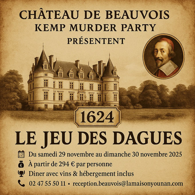 Le 29 et 30 novembre 2025, le Château de Beauvois vous emmène au temps de Louis XIII, avec une enquête : " Le jeu des Dagues" ® . Vous y rencontrerez Richelieu et bien d'autres personnages de 1624...vous serez d'ailleurs, vous -même, en 1624. Ce week-end à la cour du Roi Louis XIII et d'Anne d'Autriche ne sera pas de tout repos ...quand un complot vient éclabousser la partie de chasse de la cour royale, Marie de Médicis voit rouge ! Il est temps de prendre vos réservations au 02 47 55 50 11 ou par mail : reception.beauvois@lamaisonyounan.com. Louis XIII a besoin de vous !